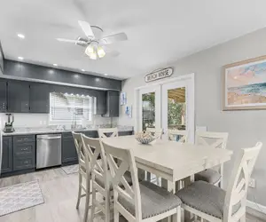 The newly renovated kitchen is a standout feature of this home. It's fully equipped with all-new appliances, modern cabinetry, and generous counter space for preparing family meals or beach snacks. The adjacent dining area seats eight comfortably, providing the perfect setting for shared meals and planning your next day's adventures.