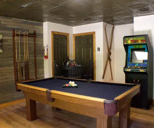 This three story beauty is a gorgeous and well-decorated cabin in Alpine Village of Downtown Gatlinburg. Walk inside to an floor plan featuring a large kitchen, dining room, workspace, and living room.; complete with an electric fireplace, large flat screen t.v., and half bath. The back patio from the living room has a brand new hot tub and large patio table for sitting. The upstairs features two King Master Suites that both have electric fireplaces, sitting areas, full closets and dressers, full bathrooms, and private back decks with sitting areas to take in the beautiful surroundings. The downstairs features a second living room with couch that turns into a sleeper, pool table, arcade, pub style table, and the 3rd King Master Suite with sitting area, electric fireplace, and full bathroom. This house is pet friendly for a minimal pet fee.