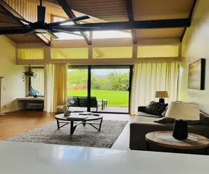 Perfectly located ground floor unit on the 1st tee of the Fazio Course and a few steps away from Lei Lei's restaurant. Free parking that's located close to unit with a sidewalk leading to the entrance making it easy to load/unload your belongings and is wheelchair accessible. The lovely 2 bedroom with a loft and 2 bathroom unit has wood flooring throughout the 1st floor and carpet in the loft and master bedroom upstairs. Walk-in shower upstairs and tub/shower downstairs. Open lanai perfect for sitting and watching the sunset. Smart TV in the living room and a flat screen TV in master bedroom. Window A/C units in both bedrooms. Sleeps a total of 6 with four twin beds, one King bed, and a queen sofa sleeper. Full kitchen has refrigerator/freezer, stove, oven, microwave, coffee maker, toaster, and blender making it ideal in preparing meals. Spacious, roomy condo. Perfect home away from home. All linens and towels are provided. This property also has pickleball, basketball and Tennis courts.