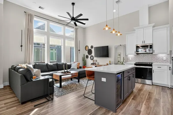 The first floor features a private bedroom and full bath, making it perfect for guests who want added privacy, a quiet workspace, or a comfortable setup for long-term stays. Upstairs, the open layout connects the living room, dining area, and fully equipped kitchen, offering a bright and inviting space to relax or work. The kitchen includes stainless steel appliances, quartz countertops, a beverage fridge, and plenty of storage for extended visits.