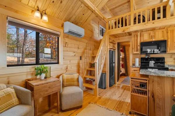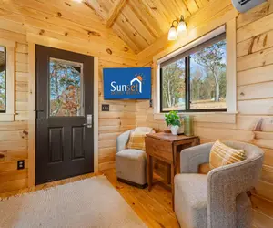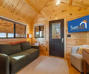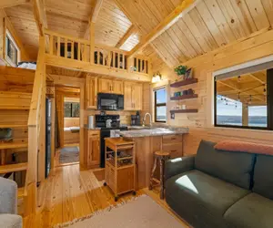 Inside, the tiny home is thoughtfully laid out to maximize both comfort and space. The main bedroom features a comfortable queen bed, while the twin bunk beds and two additional twin beds in the loft provide plenty of sleeping room for up to six guests. Warm wood finishes, soft lighting, and cozy décor create a welcoming atmosphere you'll love coming back to after a day of exploring—or simply relaxing.