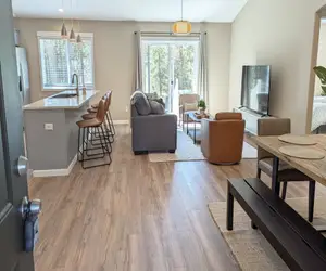 The Dining, Living, and Kitchen are all in the main area with an open concept. To your right as you walk in is the dining area. A lovely wood table with bench and chairs, it seats 6 or 7 for a family dinner. Lit by a large front window and overhead lights, you'll have no issue seeing how delicious dinner is.