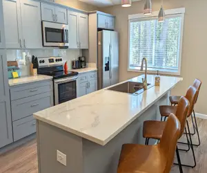 Kitchen: The Kitchen is semi-galley style with a large Island on one side. The countertops are Quartz with a veined-granite look. All new stainless steel appliances. The island seats four and houses the sink and dishwasher.