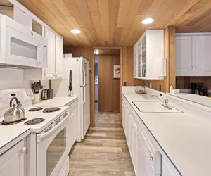 - Galley kitchen with major appliances and open cupboards for easy access.