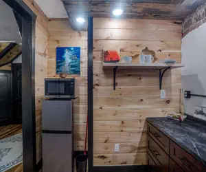 The space includes a welcoming living and sleeping area with local Kentucky inspired decor, along with a simple kitchenette equipped with a mini fridge, freezer, and microwave for light meals and snacks. The bathroom is updated, and the atmosphere feels clean, warm, and inviting.