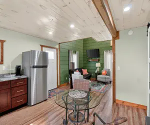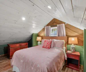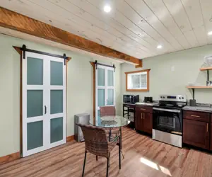 Fully Equipped Kitchen: Channel your inner chef in a spacious kitchen featuring dark wood cabinetry, sleek stainless steel appliances, and plenty of counter space. Enjoy your morning coffee at the glass bistro table or prep a full meal after a day of exploring.Loft Bedroom: Climb the stairs to your private sanctuary. The spacious upstairs loft features vaulted white-plank ceilings, a plush queen bed, and soft ambient lighting, creating a serene atmosphere for a restful night's sleep.Modern Bath: The bathroom makes a statement with bold, designer wallpaper, a sleek black vanity, and a glass-enclosed walk-in shower.Comfort & Convenience: Stay cool with the efficient mini-split climate control, and take advantage of the in-unit laundry room—perfect for longer stays.Outdoors & LocationForget the stress of street parking. This property includes dedicated off-street parking with enough room for two cars or even a boat trailer, making it a rare find for those visiting the nearby marinas.