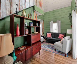 The SpaceStep inside to an airy, open-concept living area featuring striking sage-green shiplap walls and eclectic mid-century modern decor. The interior balances rustic elements—like the reclaimed metal banister and natural wood ceilings—with high-end finishes.