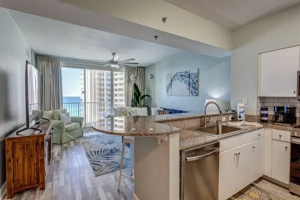 Come on in and step into the kitchen, featuring granite countertops and 4 barstools at the eat-in kitchen island. The open layout allows for you to see straight to the beach from the kitchen! Fully stocked with everything you need to enjoy your morning coffee or a full gourmet meal. Step into the living area with its comfortable furniture, queen sleeper sofa with an upgraded gel mattress, and a large flat screen TV which is perfect for movie nights!