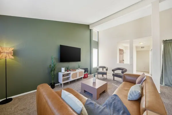 Relax in a bright, open living area with comfortable seating, a large smart TV, and warm natural light. It’s the perfect place to unwind after a day of exploring Albuquerque.