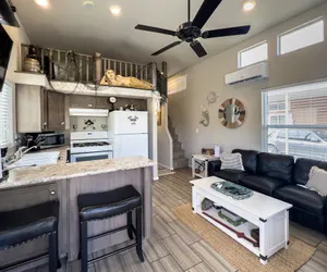 River Lodge Resort is a beautiful 96 acre campground on the Colorado River. RV park, bungalow rentals, Tiny Home sales, 9-hole golf course, RV/boat storage, two boat launches, clubhouse with gym and a general store. Unpretentious, old school campground with a few modern conveniences like park-wide WIFI and a riverfront yoga studio.Tiny house on the front row of beautiful River Lodge resort. One bedroom with a queen bed one the main level. Two queen beds in the upstairs loft. (about 4 feet floor to ceiling)