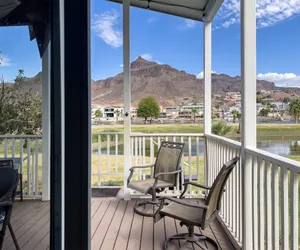 ON the CALIFORNIA SIDE in RIVER LODGE RESORT! Come experience all the River has to offer at Siren's Adventure. Located in beautiful River Lodge Resort this waterfront tiny home packs a big punch! A fun pirate and mermaid theme awaits you! With a master, loft, bathroom, living room, and kitchen this house will surely meet all your getaway needs! Enjoy your stay while kicking back on the patio, on the water, or keep cool inside under the two air conditioners. This house comes fully equipped for a great fun-filled getaway. Three queen beds, two tvs, and a comfy couch. Your Siren is calling!