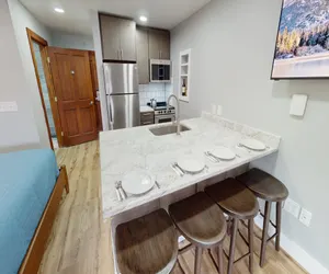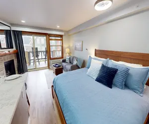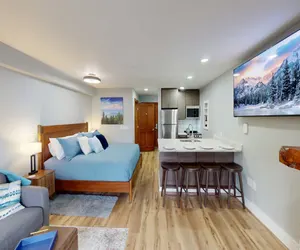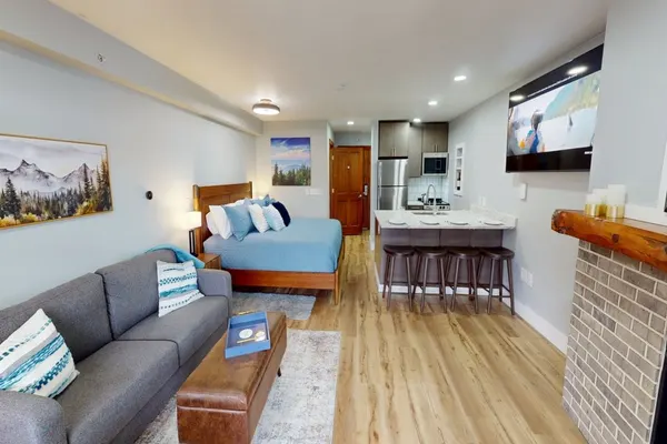 Luxury Top Floor End Unit with Large Private Balcony. Rimfire 416 offers an elevated mountain retreat from its coveted top floor end unit position in the heart of the village. This newly renovated getaway features a large private balcony with stunning sunset mountain views, perfect for relaxing after a day on the slopes or exploring the village.Inside, the space blends style and comfort. A king size bed and queen pullout sofa accommodate up to four guests. The condo has 65" Smart TV with fast, streaming ready Wi Fi; and for added convenience, the TV setup includes an HDMI wall input, allowing you to bring your own gaming system and plug in with ease. The unit also includes air conditioning, ensuring year round comfort.The modern kitchen features granite countertops and new stainless steel appliances, while the updated bathroom offers a large, contemporary shower with a spa like feel.Guests of Rimfire 416 enjoy access to premium building amenities:• Heated underground parking available for a fee• Two outdoor hot tubs• Dry sauna• Health club with treadmill, elliptical & stationary bikeWith the slopes, restaurants, shops, and village plaza only steps from the Rimfire lobby and ski locker, this luxury top floor retreat offers an exceptional blend of comfort, convenience, and mountain ambiance.
