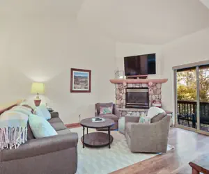Upstairs, the open living space is warm and inviting with a stone fireplace, comfortable seating, and access to the outdoor deck with a private grill—ideal for soaking in the views after a day of adventure. Additional amenities include free Wi-Fi, smart TVs, and a private garage perfect for one car and storing all of your gear.