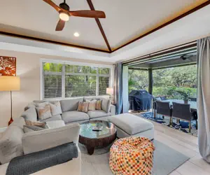 Cool Italian porcelain tile flooring runs throughout the main living areas, while all three bedrooms feature new, plush flooring for comfort. Enjoy tropical breezes bug-free with a custom automatic vertical lanai screen and rest easy knowing an additional split A/C system has been added to one guest room for extra comfort.