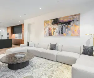 At the heart of the home is a contemporary kitchen featuring high-end stainless steel appliances, custom wood cabinetry, and a large island perfect for casual dining or entertaining. The adjoining living room invites relaxation with a plush sectional sofa and curated modern artwork. Each bedroom is designed for comfort, including a bunk room ideal for younger guests. Three well-appointed bathrooms offer modern fixtures and thoughtful layouts, with at least one featuring a bathtub-shower combination.