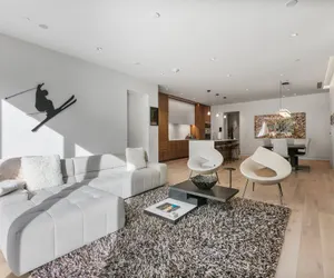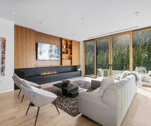 Framed by panoramic views of the surrounding mountains, the home features a spacious open-concept living area with floor-to-ceiling windows, sleek modern furnishings, and an electric fireplace for cozy après-ski evenings. The chef’s kitchen is fully equipped with high-end appliances, an oversized island, and a stylish dining area ideal for entertaining. Step onto the private patio to enjoy the mountain air and striking alpine vistas.