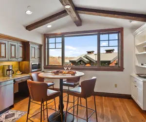 A fully equipped gourmet kitchen with Viking appliances and a stylish dining nook makes entertaining effortless. The inviting bedroom offers a plush bed, fireplace, and large windows overlooking the ski runs—ideal for a romantic mountain escape or a peaceful solo getaway.