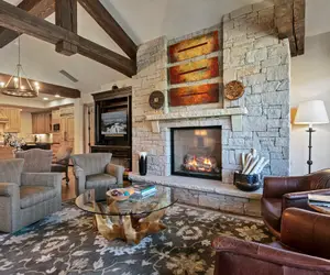 The open-concept living space features vaulted ceilings with exposed wooden beams, a stunning stone fireplace, and large windows that bring in natural light and frame the surrounding landscape. The gourmet kitchen is outfitted with high-end stainless steel appliances, custom wood cabinetry, and a granite island—ideal for cooking, dining, and entertaining. Additional living spaces include a cozy den with plush seating and nature-inspired artwork, while a private balcony invites guests to relax and enjoy the outdoor scenery.