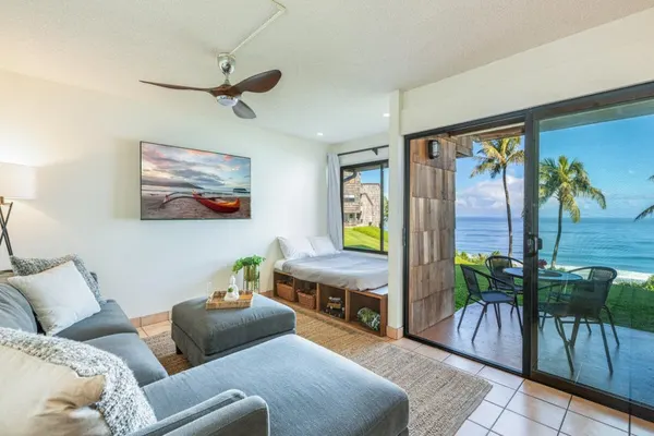 The open-concept layout feels bright and spacious, with large windows and sliding doors that bring in natural light and showcase the scenery. The fully equipped kitchen makes meals easy, and the living and dining areas open directly to the lanai for effortless indoor-outdoor living.