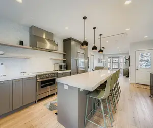 At the center of the home, the kitchen combines form and function with stainless-steel appliances, a sleek induction range, and generous counter space for meal prep or casual dining. Clean lines, modern cabinetry, and warm finishes create a stylish yet welcoming atmosphere. The first full bathroom is conveniently located just off the kitchen—ideal for guests or quick refreshes between adventures.