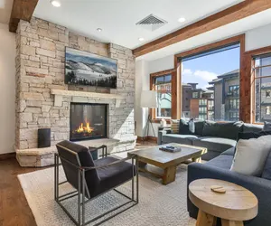The open-concept living area includes a gourmet kitchen with high-end appliances, navy cabinetry, and a granite island, flowing seamlessly into a cozy living room with a stone fireplace. Large windows and a private balcony showcase the alpine surroundings, inviting you to unwind after a day on the slopes.
