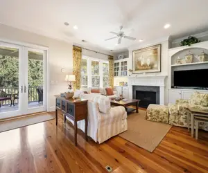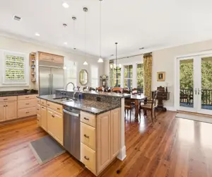 The main (third) level is the heart of the home, showcasing an open-concept living, dining, and kitchen area accented by heart-of-pine floors and a walk-in pantry. The kitchen is fully equipped with a double oven, range, refrigerator, microwave, dishwasher, and disposal. The primary suite on this level features two generous walk-in closets and a comfortable bath. A second screened porch and grilling porch overlook scenic wooded views toward historic Arcadia Plantation, offering both privacy and natural beauty. The top floor includes a fifth suite complete with its own kitchenette, sitting area, and private upper deck, an ideal retreat within the home.