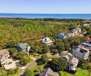 AMENITIES INCLUDE: an elevator to all levels, TVs in every bedroom and living space, a cozy fireplace, and multiple seating areas on each floor for gathering or relaxing. The home features screened porches, inviting outdoor living spaces, a grilling area, and an outdoor shower, perfect after a day at the beach. Guests will enjoy a fully equipped kitchen with a double oven, a three-car garage with room for golf carts and bikes, and the privacy of a gated community. Located just about 700 yards from the ocean and close to the top golf courses, this home provides the perfect balance of coastal charm.