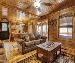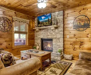 Inside, the cabin features inviting living spaces with a stacked-stone gas fireplace, hardwood floors, and plenty of seating for gathering together. The fully equipped kitchen includes a Keurig Duo with carafe and K-cup options, modern appliances, and ample counter space, making it easy to prepare everything from quick breakfasts to full family meals. A nearby dining area offers space for shared meals, board games, and planning your next adventure.