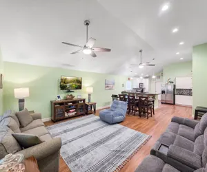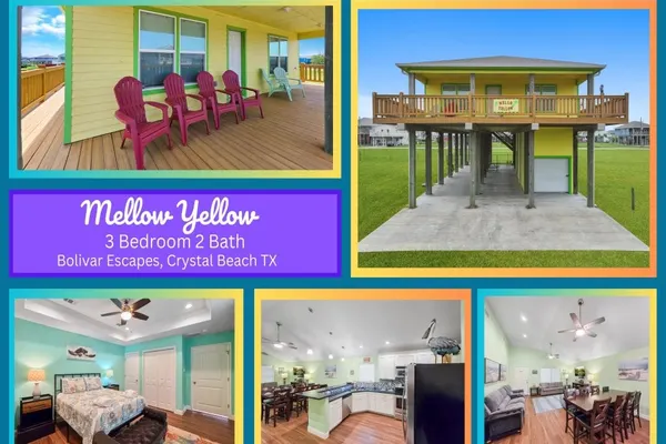 This home, located in the heart of Crystal Beach, is pet-friendly with a $200 Non-refundable pet fee. The open-concept living room/ kitchen area is inviting and comfortable for families to spend time together. The large dining table accommodates 10 guests and is the perfect space for family meals, playing games, and puzzles. The bar area provides space for serving or preparing meals. Speaking of meals, you'll find this kitchen fully stocked with gadgets, pots, pans, and all the extras needed to make cooking a breeze! If you need to stay connected through your devices, Mellow Yellow has Wifi. Just enter the password information to interact with your social media outlets, and stream your favorite shows on the TV in the living room. All the TVs in the bedrooms use an antenna and have DVD players. There are also board games and cards for a night of family fun! The bedrooms are comfortable for a good night's sleep. The primary bedroom has a queen bed and an attached bathroom. Bedrooms two and three have 2 queen beds in each room. In the living room, there is a sleeper sofa for additional sleeping. You will enjoy spending time outside on the deck watching beautiful sunrises and sunsets while enjoying your favorite beverages. Downstairs, you will find lots of covered space for grilling on the charcoal grill, cleaning your "catch of the day" at the outdoor sink, while your little ones play. There is even a small fenced-in area for the pets to run safely. You are just a short walk away from getting "your toes" in the sandy shore. There is also direct access to the beach by vehicle or golf cart. After a fun day in the sun, rinse everything away but your memories in the enclosed shower downstairs. You and your guests will feel perfectly "mellow" after a stay at this vacation home!