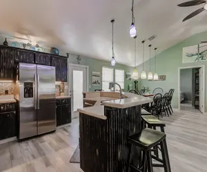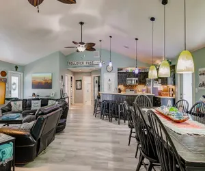 This home is pet-friendly. You are allowed to bring up to 2 dogs. Just pay the separate $200.00 Non-refundable Pet Fee. The open kitchen/dining/living area is perfect for family gatherings. While prepping meals in the spacious, fully equipped kitchen, you will never miss out on the family fun or conversations! The large dining table and island bar provide ample seating for meals. In the living room, you will find plenty of comfortable seating to gather around the TV to stream your favorite TV shows and movies. Just enter the WIFI information provided near the TV. The whimsical names on each of the bedrooms adds to the personal touches in this home. Bedroom one has a king and an attached bathroom. Bedroom two has a queen, and bedroom three has 2 twin/twin bunks. The fourth bedroom has a twin/full bunk and a twin/twin bunk. Both bathrooms newly remolded with modernized low-rise walk-in-show. Outside on the deck, you will find comfortable seating to watch our amazing sunrises and breathtaking sunsets! There is even a playhouse for the little beach lovers! Downstairs, you will find seating, hammocks, swings, and a picnic table providing an area for eating meals cooked on the charcoal pit. With this home sitting at the end of the road on three large lots, you will feel safe with the littles running and playing. When the sand and waves start calling, you will have a short walk, golf cart, or vehicle ride to the Gulf shores! After a fun-filled day at the beach, rinse away the sand and sun lotion in the outdoor, enclosed shower! This home is a slice of "Blue Heaven" year-round!
