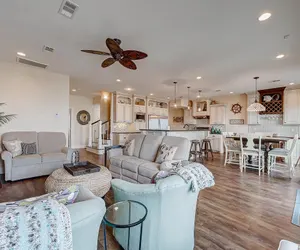 Sea Esta is a beautiful home located on the 2nd row in the Gulf Shores subdivision. This luxurious home is beautifully decorated. The living room, dining room, and kitchen are all open and spacious. The kitchen is stocked with top-of-the-line stainless steel appliances that will have you cooking like a gourmet chef! To stream your favorite TV shows or movies, you will need to enter the password information to connect to the WI-FI. You will want to unplug and enjoy the fabulous beach views from the deck while drinking your favorite beverages. There is outdoor furniture seating to accommodate everyone! You will find two bedrooms, each with double queen beds, on the main level, connected to a Jack-and-Jill bathroom. There is also a half bathroom. On the upper level, you will find a guest bedroom with a king-size bed and an attached bathroom with a shower/tub combo. Also on the upper level is the primary bedroom with a king-size bed, an attached bathroom with a walk-in shower, and access to a private deck. On the ground level, you will find a charcoal pit to grill your favorite meals or fresh catch of the day! The beach is just a step or two away! You also have access by vehicle or golf cart. For washing off all the sandy fun, there is an enclosed shower located behind the garage that requires the house key to unlock.