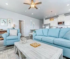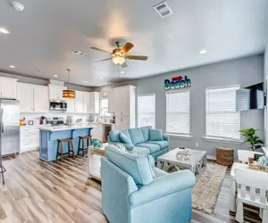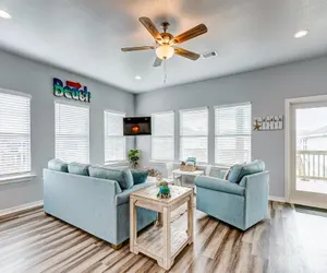 This newer built home in the quiet LaFitte's Landing Subdivision is pet-friendly with a $200 pet fee. This home welcomes you inside to a spacious, open living room/ kitchen area. The kitchen is fully stocked with all the cooking basics, even a crockpot. You and your guests can gather around the eating bar area and or small dining table to enjoy meals together. There is even a small table just right for children to enjoy! The living room easily accommodates you and your guests. The home also has internet. You can stream shows on Roku or take advantage of numerous streaming services. The WiFi password information is located in a frame near the TV. There are also Smart TVS located in all bedrooms. You will even find board games for the family to play. The bedrooms are bright and spacious, each with their own unique style. The primary bedroom has a king bed and an attached bathroom with a tub/shower combo. There is a guest bathroom in the hall. Bedroom two has a king, and bedroom three has two twin/full bunk beds. Downstairs, you will find plenty of covered space to gather, sit around the picnic table, or grill delicious meals on the charcoal pit. There is even a fenced-in area for the children to run and play. When you can no longer stay away from the sand and "sea", you are a short walk or golf cart ride away! There is an easy walking/ golf cart path at the end of Buccaneer Street for your use. This subdivision does not have vehicle drive-on access, but Cove Rd. and Stingaree Rd. do have public access. Upon returning from the beach, be sure to enjoy rinsing off in the outdoor shower located downstairs. You and your guests will surely "Delight" in the memories made at this home!
