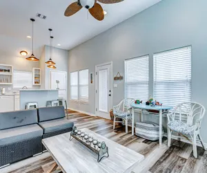 Salty Sandpiper is a charming, pet-friendly home. There is a two-pet maximum with a $200.00 non-refundable pet fee. This home has a fenced-in yard and carport area, making it a safe gathering area for small children and pets. Inside, you will be greeted with an open kitchen/living room space. The kitchen has all the amenities you need for preparing meals. There is an island/bar area with seating for your guests. Just off the kitchen, there is a laundry closet with a full-sized washer/dryer for your convenience. The Living area has comfortable seating and a TV with Hulu, Disney, and streaming abilities. Just use the WIFI information to connect. The 2 bedrooms also have TVs for your enjoyment. Bedroom one has a king, and bedroom two has a queen and a twin/twin bunk bed. You will find ample space for dining or lounging on the deck while soaking in the gorgeous sunrises and sunsets that await you. Downstairs, you and your guests can relax in the cool shade, watching the younger guests play while the adults chill while waiting for something delicious cooking on the charcoal grill. There is also seating and a picnic table for convenience. When the waves and sand start calling, you're just a short walk, golf cart, or vehicle ride away. Rinse the sand in the great outdoor shower after a fun day at the beach. The Salty Sandpiper is truly a great place to make beach memories year-round!