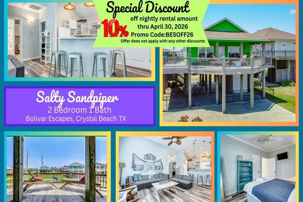 Even when provided, internet access, TV/cell service can be unreliable on the Bolivar Peninsula. We are a rural community. We apologize, but Bolivar Escapes cannot guarantee that these amenities will work during your stay. We cannot offer refunds for the disruption of these services. This home might have an outdoor camera(s) to monitor the exterior. Any attempt at disabling, redirecting, or obscuring the camera(s) is prohibited and may result in the guest being evicted without refund of outstanding nights’ rent. If a home has a lift or elevator, it is not for the renter's use unless otherwise stated in comments or with permission from Bolivar Escapes. We provide linens and bath towels in every house, and standard beds are made for your arrival. Linens will be provided in the home for all sleeper sofas, trundles, and pull-out bedding. Paper products, other than toilet tissue and paper towels, and cleaning supplies are not included.