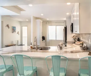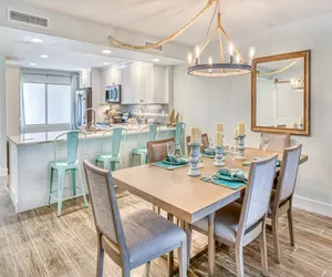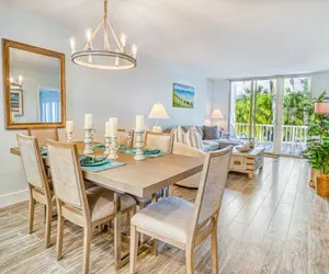 Walk into this stunning spacious Bayside condo with an open floor plan and stunning finishes. As you walk into the new kitchen, you will notice the stunning countertops, stainless steel appliances, glass-tiled backsplash, and driftwood-inspired floors. Coastal chic décor makes this a unique and one-of-a-kind condo. You will have plenty of space for entertaining at the large kitchen table with seating for six and seating for four at the breakfast bar. The open living room has a comfortable sectional couch with a flat-screen TV. A large balcony off the living area with a glimpse of the Bay and tropical surroundings. The first bedroom is off the dining area with a sleeper sofa and sliding barn door. Open the windows to your glassed-in porch while dining alfresco from one of the fabulous meals prepared in your stunning kitchen. The guest bedroom has two comfortable beds, one queen and the other twin a large flat-screen television, and ample closet space. The guest bathroom has a glass tiled shower and tub combo. The master suite is truly stunning with a king bed large closets and an attached bath with a tiled shower and dual sinks. The master bedroom also has its own lanai with a large couch for relaxing your days away all enjoying the tropical breeze in the sounds of the bay.