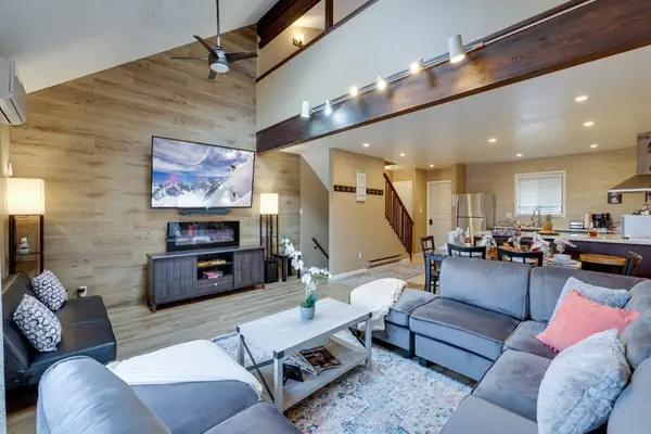 Style Meets ComfortStep inside to a bright, open-concept living space defined by soaring cathedral ceilings and an abundance of natural light. The main floor is designed for gathering, featuring a modern living room with a massive 75" Smart TV—perfect for movie nights after a day on the slopes.