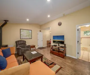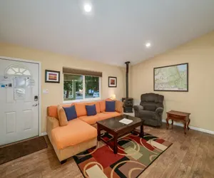The home features a living area with a gas fireplace, vaulted ceilings and a television. The kitchen is well stocked for you to prep your meals and unwind after a long day adventuring in Lake Tahoe. From the kitchen you can access the fenced in backyard. The one car garage will hold a small car, or a place to store your skis and gear. The sunny primary bedroom has a queen bed and a private bath. The second bedroom has a twin bund bed and a twin trundle bed, the perfect spot for the kids.