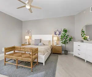 The primary suite is a peaceful retreat featuring a king-size bed, walk-in closet, desk workspace, dresser, and large flat-screen TV. Floor-to-ceiling windows and private balcony access fill the room with natural light. The ensuite bathroom has been beautifully renovated and includes a quartz double-sink vanity, a separate water closet, and a spacious walk-in shower with glass enclosure. One guest bedroom offers a queen bed, generous closet space, and a flat-screen TV, with a nearby full bath featuring a quartz vanity and tub/shower combination. The third bedroom is ideal for families, furnished with a twin-over-full of bunk bed plus an additional twin trundle, along with a large closet, dresser, and HDTV. A full-size washer and dryer are located in the unit, and an additional half bath with a tiled walk-in shower is conveniently located off the hallway.