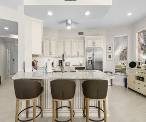 Guests enter through a secure lobby featuring an elegant cascading fountain before taking the elevator to the second floor. Inside, the condo opens to a bright foyer leading into a stunning, coastal-inspired open living space with tile flooring and soaring ceilings throughout. The chef's kitchen is thoughtfully designed with quartz countertops, tile backsplash, abundant cabinetry, and stainless steel appliances, including a five-burner glass-top range, built-in microwave, French-door refrigerator with water and ice dispenser, dishwasher, and a dedicated wine refrigerator. A breakfast bar provides seating for three, while the adjacent round dining table comfortably seats four.
