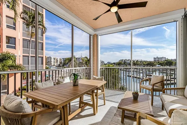 The living area is furnished for comfort with a spacious sectional, large HDTV, armchair, and ample lighting. Floor-to-ceiling sliding glass doors lead to a screened-in balcony furnished with outdoor dining for up to six, where guests can enjoy sweeping views across the deep-water canal toward Fish Tale Marina and the Gulf of Mexico.