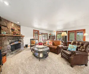 One more step down into the living space is the dining table, game table and streaming TV. The fireplace is not for guest use, but ads to the mountain cabin feel. Enjoy family game night or relax with a movie.