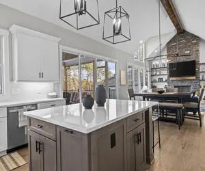 When you step into our lake house, you are welcomed by the serene sounds of nature and the breathtaking view of Lake Hartwell outside. As you head to the gourmet kitchen, you'll find sleek countertops, top-of-the-line appliances, and ample space to unleash your culinary creativity. Picture yourself preparing delicious meals together with the whole family while enjoying the panoramic view of the lake through large floor-to-ceiling windows.