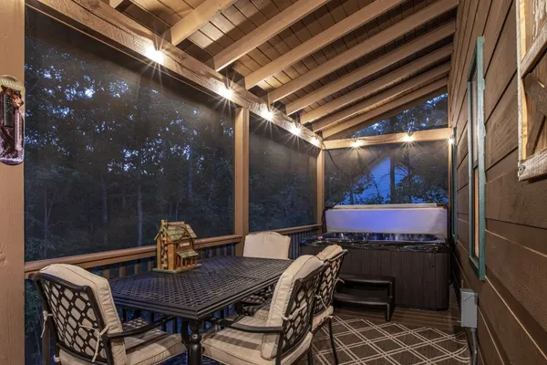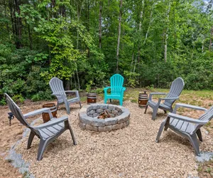 Step outside to discover an inviting outdoor space, complete with a 3 person hot tub, ambient lighting, and a fire pit surrounded by comfortable chairs—perfect for roasting s'mores under the starry sky. The cabin also boasts a game room for indoor entertainment and a convenient laundry room to keep your outdoor gear fresh.