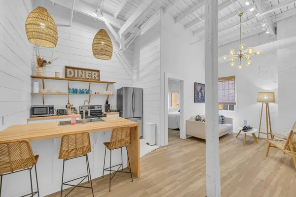Just off the living room, the fully equipped kitchen features stainless steel appliances, plenty of counter space, and a bar that seats three. It's perfect for easy breakfasts, quick snacks, or a laid-back drink before heading out for the evening.