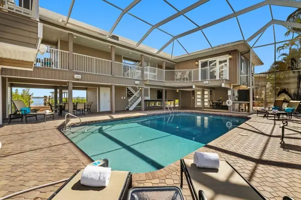 The property features numeorus separate buildings, all connected by elevated walkways and spacious decks that wrap around a beautifully landscaped courtyard. At the center is a heated pool enclosed within a soaring two-story screened structure—your own private resort environment.