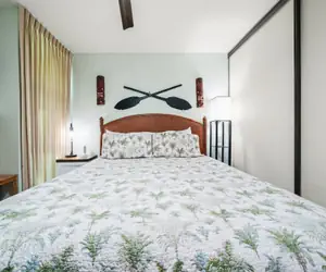 The bedroom is designed for rest and relaxation, featuring a comfortable king sized bed, tropical accents, and a peaceful atmosphere. The bathroom is clean and updated, offering convenience and functionality for everyday use. Additional features include air conditioning in the living room, ceiling fans, in-unit laundry access and tasteful furnishings throughout. The condo is part of the well-maintained Maui Vista community. Featuring landscaped grounds, multiple pools, tennis and pickle-ball courts and bbq areas and free convenient on site parking.