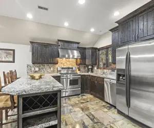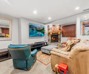 The fully equipped kitchen has everything you need to cook up easy meals, with a breakfast bar seating three and a dining table that seats six. The upstairs living room offers plenty of cozy furnishings for your whole group to relax by the fireplace or settle in for a movie night. Downstairs, a second living and game room with a flat-screen TV, gas fireplace, and wet bar gives everyone room to spread out and unwind. Just outside each level, guests can enjoy a private deck to take in the fresh mountain air, or warm up in the sauna after a day of adventure.