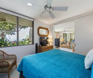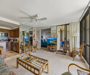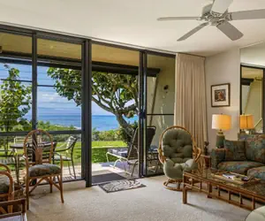 Unit A17 at Napili Point Resort is a 1-bedroom, 1-bathroom oceanfront condo in Maui, Hawaii, with 602 square feet of interior space plus an 86-square-foot lanai. It sleeps up to four people with a king bed in the bedroom and a queen hide-a-bed sofa in the living area, and includes air conditioning, ceiling fans, two TVs, and a shower (no tub). The prime oceanfront location offers direct views ideal for turtle spotting and sunsets in the relaxed Napili area.