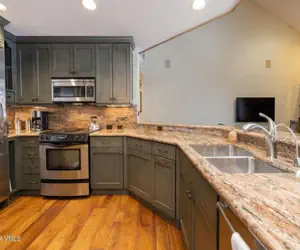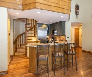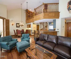 This condo features a large living room , wood fireplace, five bathrooms, deck area with a gas grill, and a master suite with a king size bed. The second room has a king, third room has two queen size beds. Also equipped with a full kitchen and in unit washer and dryer. There is an assigned ski locker on the ski access level, free wifi, great views of slopes and Village.