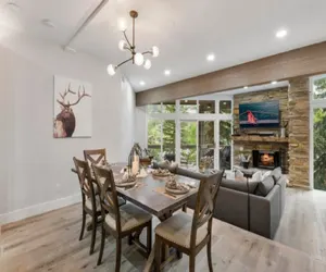 Gather in the open-concept living and dining area, complete with an oversized sectional sofa, large dining table, real wood-burning fireplace, and big-screen TVs in every room. The chef-ready kitchen is fully equipped and overlooks the living space and dramatic floor-to-ceiling windows showcasing spectacular Deer Valley slope views. A full-size washer and dryer add convenience during longer stays.